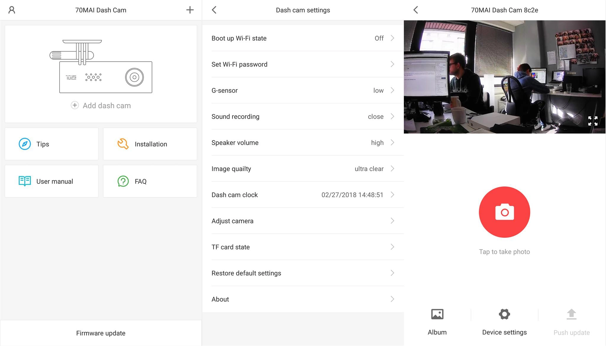 Um zu wissen, ob die 70 Minutes auch richtig angebracht ist und keine schrägen Bilder liefert, gibt es in den App-Einstellungen einen entsprechenden Assistenten. Die gemachten Aufnahmen lassen sich von der App direkt auf das Smartphone herunterladen, hierfür muss man allerdings mit der Dashcam verbunden sein.