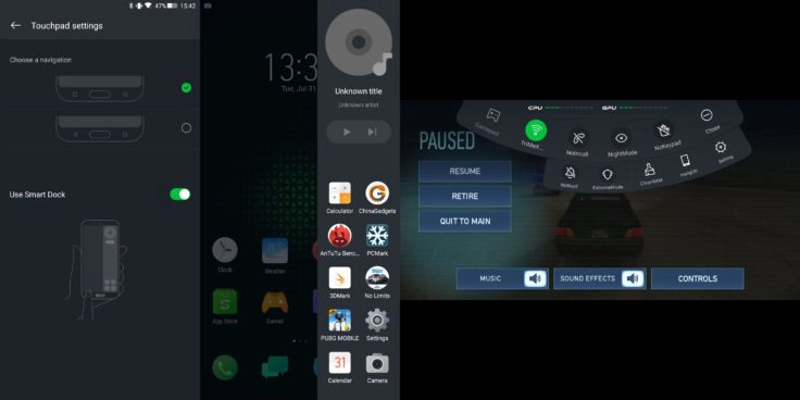 Wir haben zum Testen noch die chinesische Version, es gibt aber inzwischen auch eine Global Version, die ich euch sehr empfehlen möchte, da dort Play Store usw. direkt vorhanden und die ganze Software auch auf Deutsch einstellbar ist. Aber auch auf Englisch ist das Black Shark mit normalen Englischkenntnissen gut zu bedienen. So kann man einstellen, dass sich ein Smart Dock öffnet, wenn man von rechts nach links (oder umgekehrt) über den Fingerabdrucksensor streicht. Dort wird die aktuell spielende Musik angezeigt und ihr könnt eure meist-genutzten Apps ablegen.