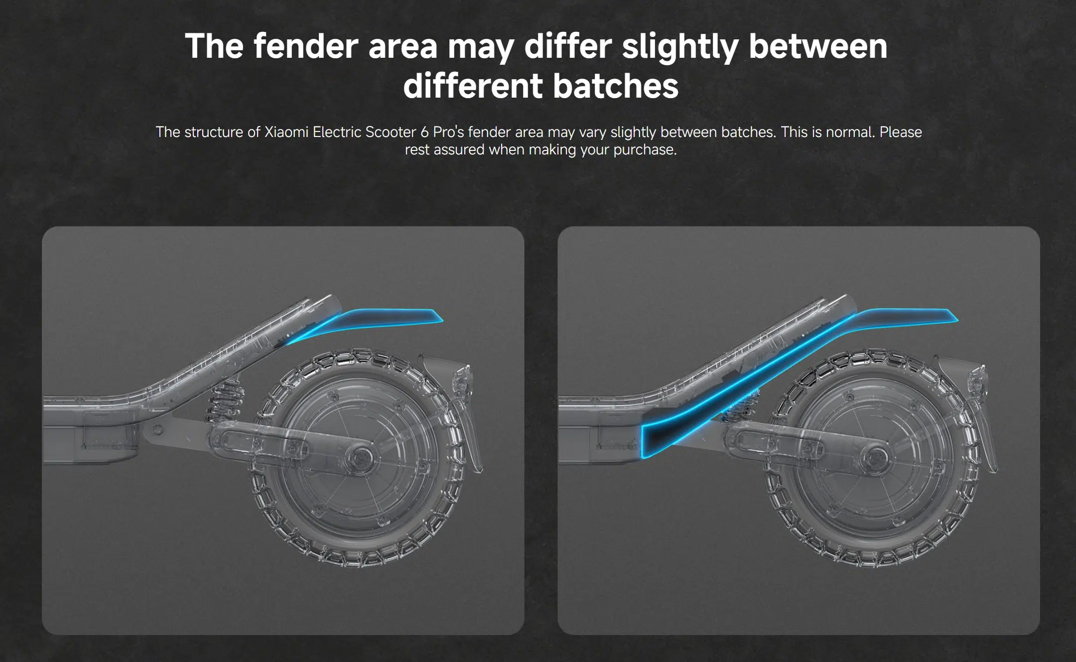 Wo wir noch abwarten müssen, ist eine Sache, die wir auf der Produktseite entdeckt haben: Xiaomi weist darauf hin, dass der Bereich des Schutzblechs je nach Charge variieren kann. Anscheinend gibt es zwei Versionen des Schutzblechs. Eine erstreckt sich direkt vom Trittbrett aus nach oben, die andere ist erst kurz über dem Reifen befestigt. Solange die Funktion gleich bleibt, ist das in Ordnung, aber was soll das überhaupt? Produzieren hier zwei Fabriken unterschiedlich? Oder ist es nur eine erste Charge, bevor man wechselt? Das wirkt schon sehr skurril und etwas unorganisiert.