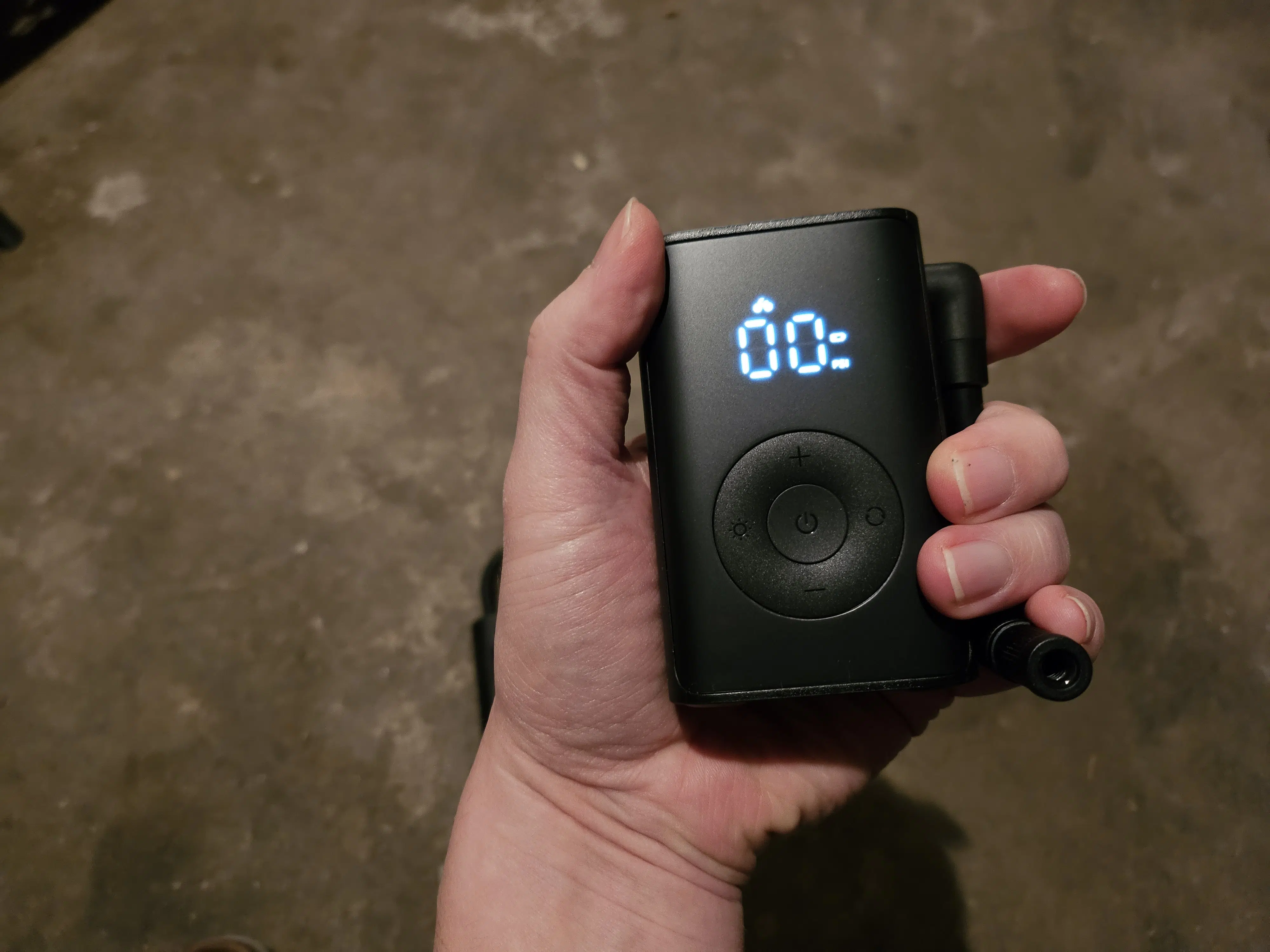 Es gibt ein paar wählbare Modi für Roller, Fahrräder und Bälle, die schon ungefähr den richtigen Druck eingestellt haben. Man kann zwischen der Anzeige in bar oder PSI wählen und den Druck auch noch manuell anpassen, ehe man die Starttaste drückt und der Kompressor beginnt, zu arbeiten. Das ist ziemlich laut und sorgt für verstörte Blicke, wenn man mitten im Büro mal eben den Kompressor am letzten Test-E-Scooter ausprobieren möchte. Fragt mich nicht, woher ich das weiß. Ist der gewünschte Druck erreicht, stoppt die Pumpe von allein.