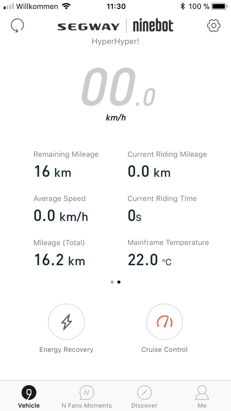 Ohne Registrierung lassen sich ansonsten noch allerhand nützlicher Informationen, wie die verbleibende oder bereits zurückgelegte Reichweite einsehen. Das Licht kann ein/aus gestellt, das metrische System umgestellt und der Tempomat und das Rücklicht (de-)aktiviert werden.