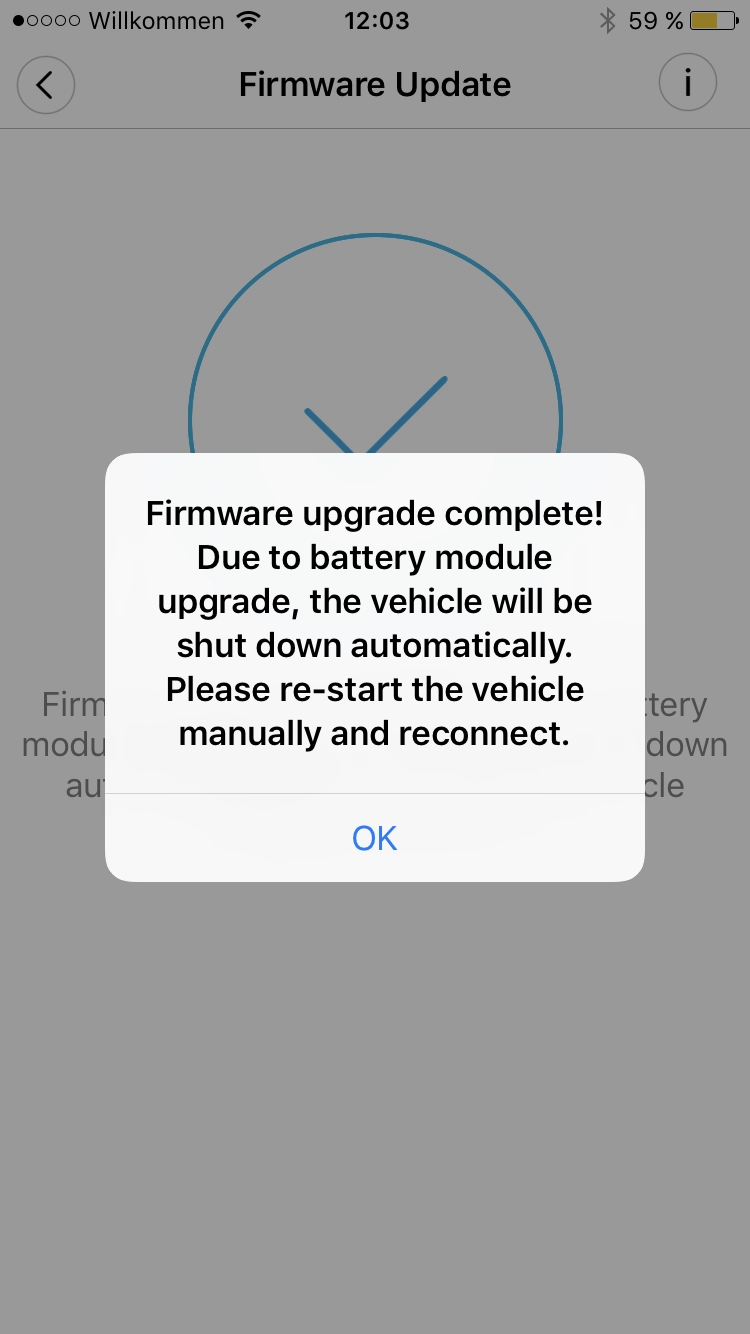 Mit der offiziellen Ninebot App (iOS & Android) kann man sich über Bluetooth mit dem Xiaomi M365 verbinden. Es werden einem direkt, nach der ersten Verbindung, Updates angeboten. In unserem Fall ein Firmware- und ein Batterieupdate. Dies lässt sich jedoch auch später manuell über das Menü anstoßen.
