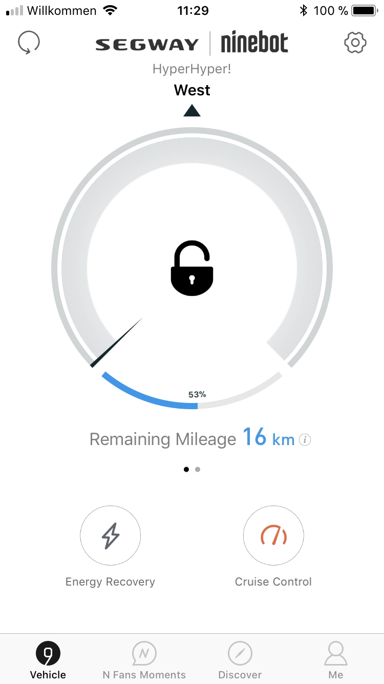 Ohne Registrierung lassen sich ansonsten noch allerhand nützlicher Informationen, wie die verbleibende oder bereits zurückgelegte Reichweite einsehen. Das Licht kann ein/aus gestellt, das metrische System umgestellt und der Tempomat und das Rücklicht (de-)aktiviert werden.