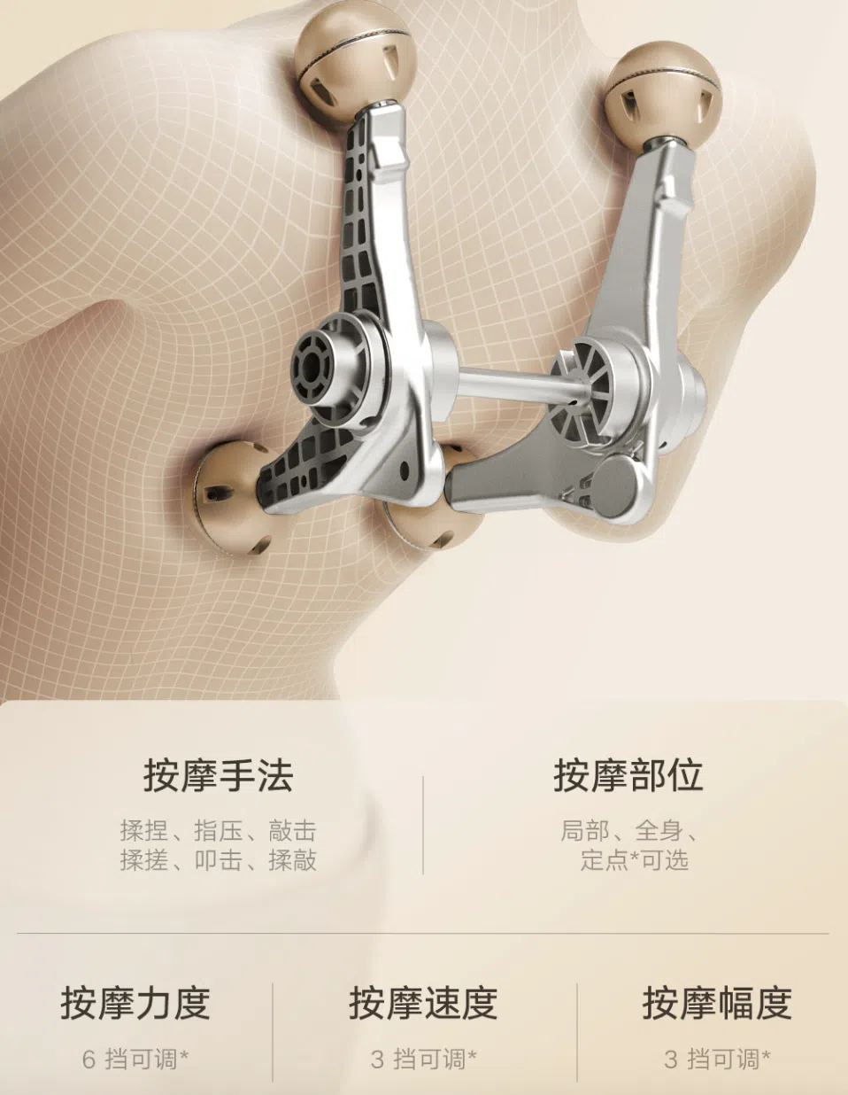 Der Massagesessel verfügt über eine intelligentes, druckempfindliches 4D-Bewegungsystem. Dabei kann sich der Massagearm im Rückenteil nach oben, unten, links, rechts, vorne und hinten bewegen, natürlich gepolstert hinter der Rückenlehne. Über den eingebauten Sensor erkennt das Gerät den ausgeübten Druck und passt diesen in Echtzeit an. Insgesamt kann der Arm bis zu 7 cm hervorschauen.