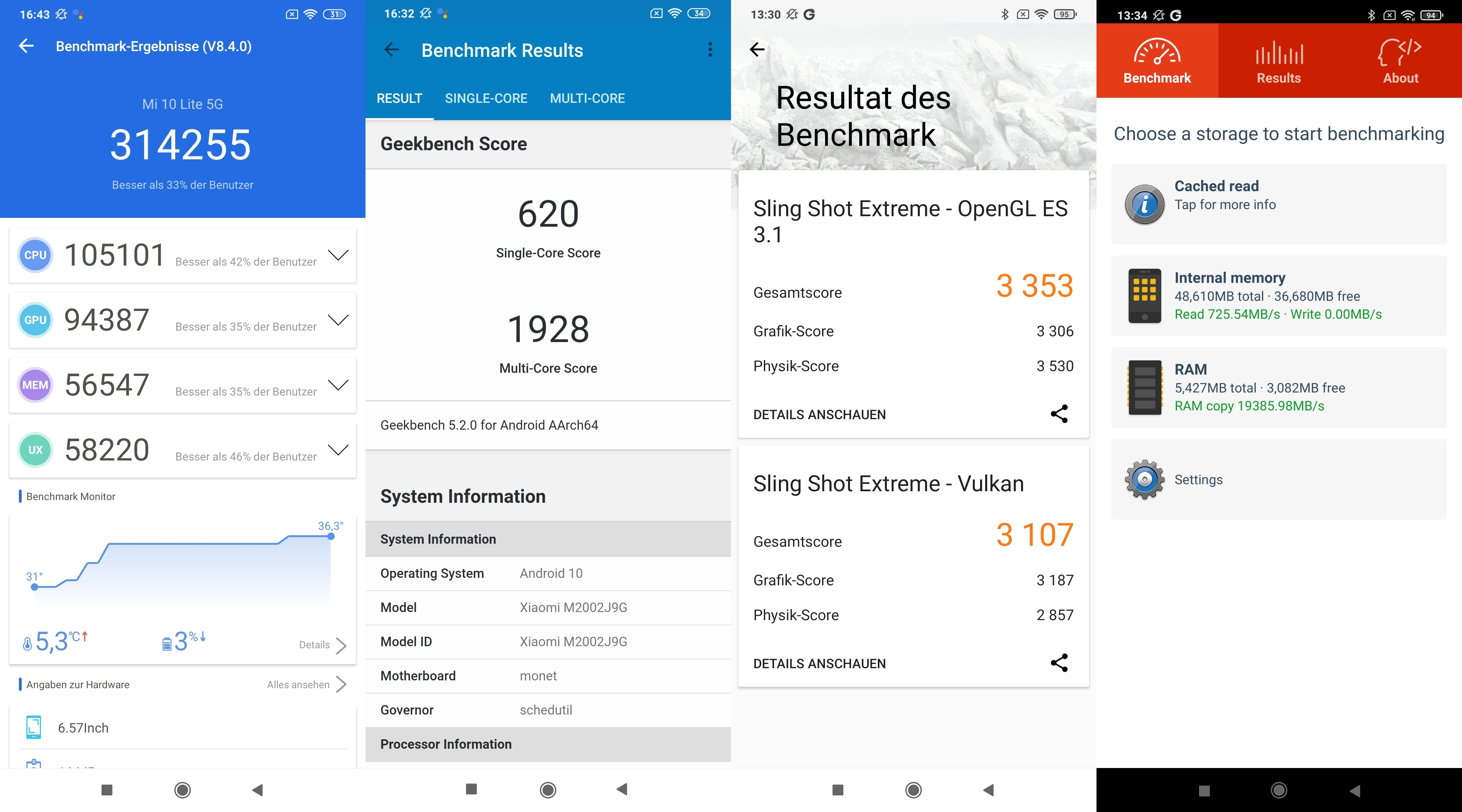 Wie schon beim OnePlus Nord liefert der SD 765G auch hier ordentlich ab. Das Mi 10 Lite 5G läuft flüssig und ohne Ruckeln, reagiert schnell auf Eingaben und hat auch mit Multitasking keine Probleme. Auch Spiele könnt ihr auf den höchsten Grafikeinstellungen zocken, ohne das das Handy ins Stottern gerät. Das OP Nord fühlt sich noch minimal schneller an, das liegt aber vermutlich einfach an dem 90Hz Display und der 180Hz Abtastrate des Touchscreens.