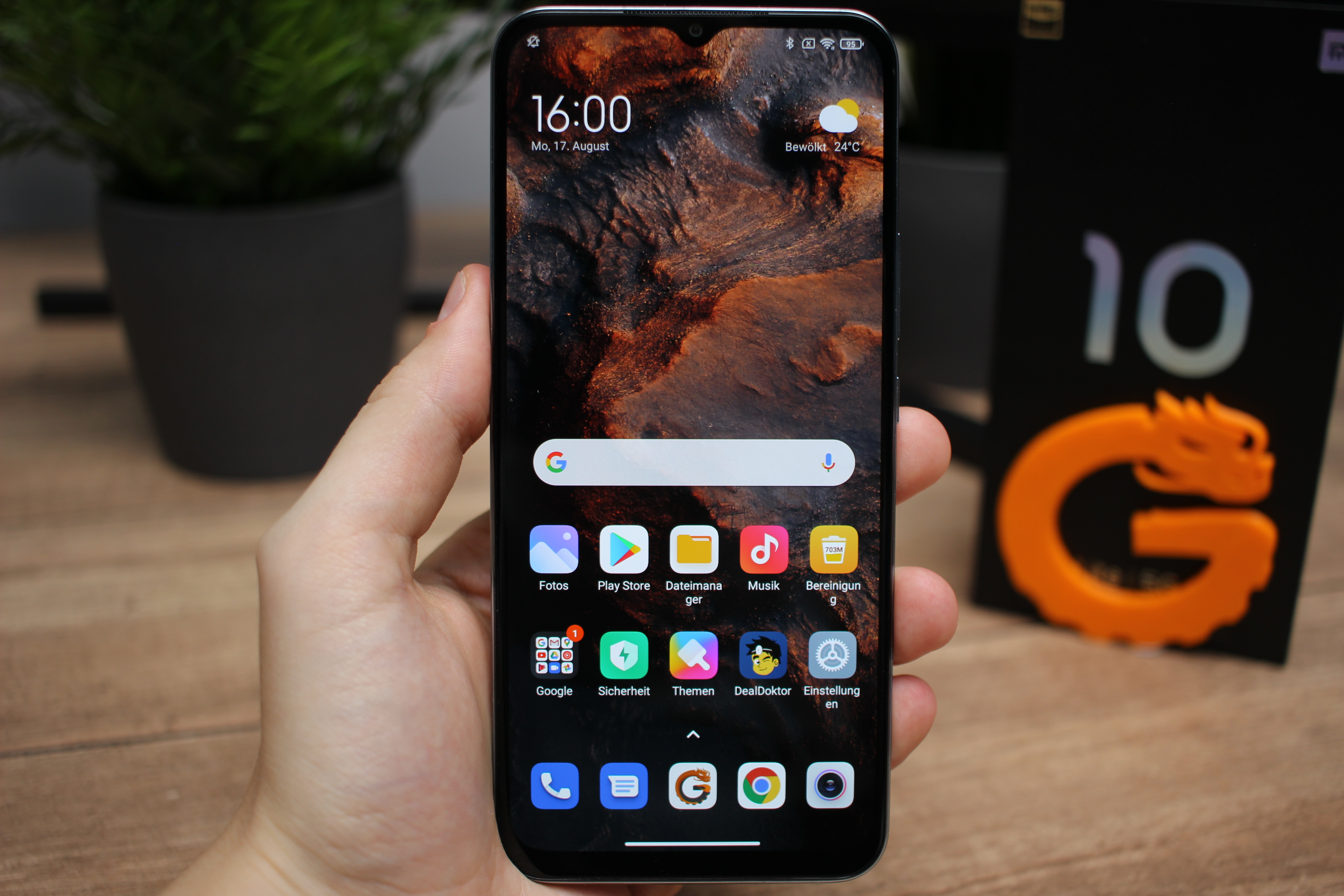 Wie bereits erwähnt setzt Xiaomi hier auf ein AMOLED Display mit einer FullHD+ Auflösung von 2400 x 1080 Pixeln. In Kombination mit der Größe von 6,57 Zoll ergibt sich eine Pixeldichte von 401 Pixeln pro Zoll. Oben in der Mitte befindet sich eine kleine Teardrop-Notch, in der die Frontkamera sitzt. Auffallend sind die sehr stark abgerundeten „Ecken“ des Displays, wodurch die Ränder oben und unten nochmal etwas größer wirken. Persönlich wäre mir diese Abrundung schon zu viel, ich mag lieber etwas eckigere Displays. Immerhin ist das Display schön flach und nicht Curved wie beim Mi Note 10 Lite.
