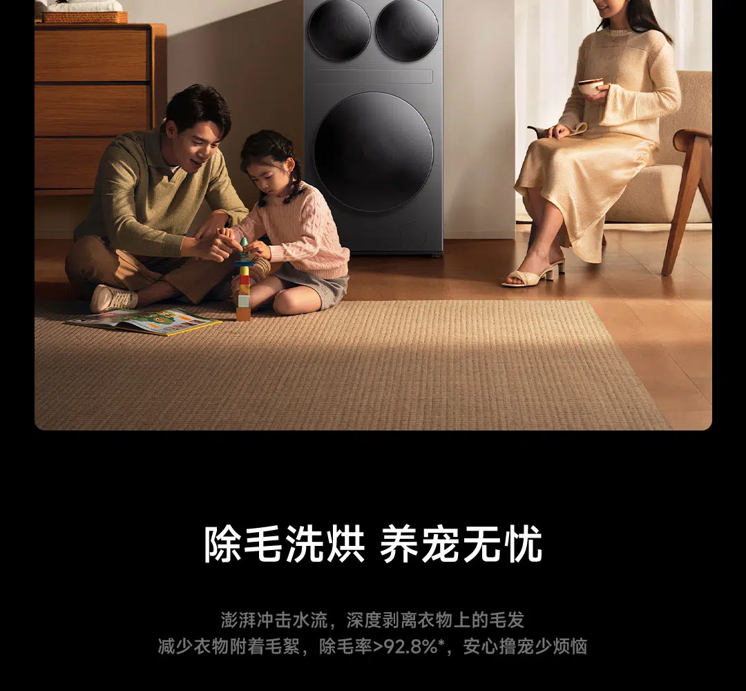 Damit nicht genug, fungiert das Gerät natürlich auch als Trockner. Die Haupttrommel trocknet bis zu 9 Kilogramm, während die kleinen Einheiten immerhin noch jeweils 500 Gramm trocknen können. Damit das Ganze nicht wie ein startender Düsenjet klingt, verbaut Xiaomi unabhängige Aufhängungen und Direct-Drive-Motoren, die Vibrationen minimieren sollen.