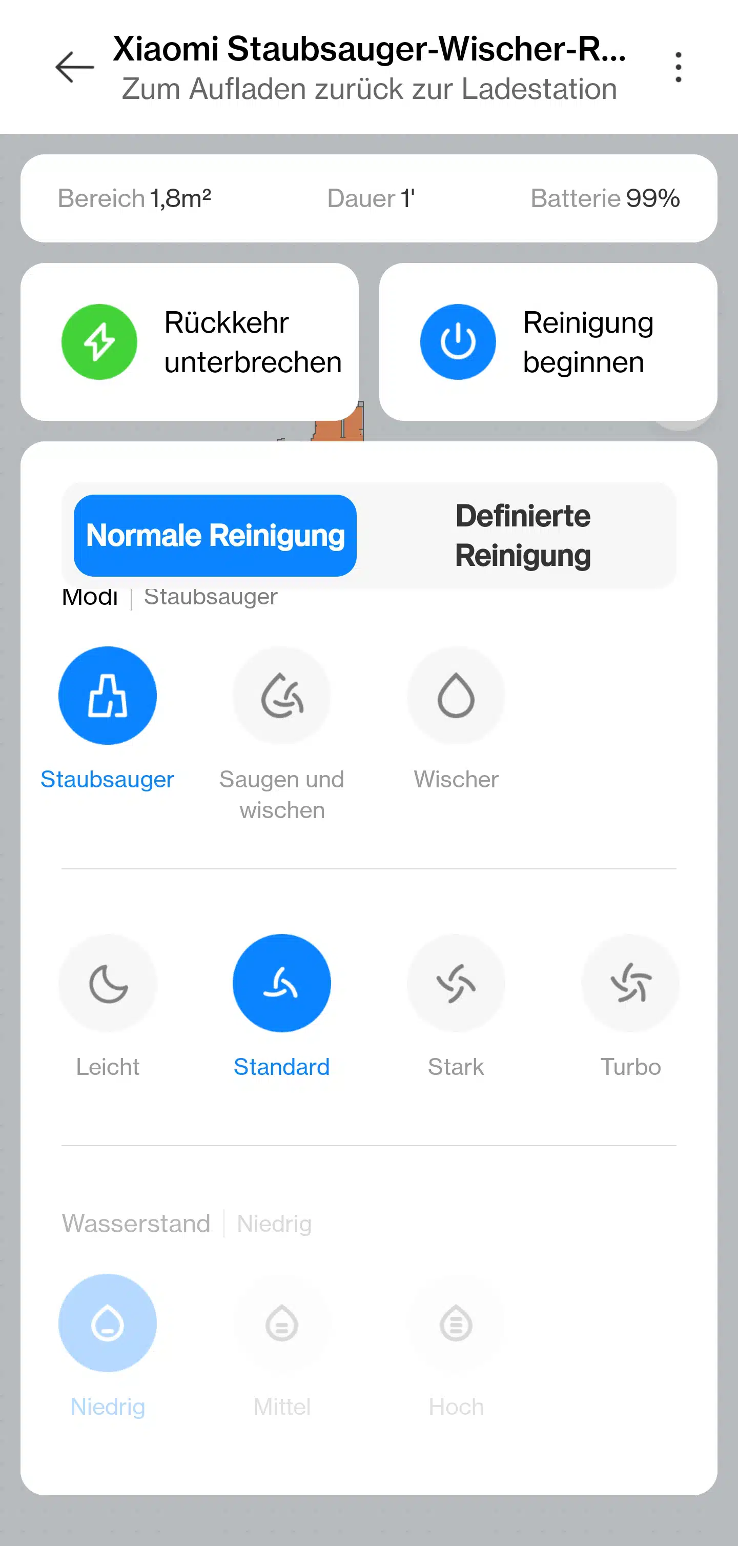 Auch eine Wischfunktion ist verbaut, die eine elektrische Wasserflussanpassung in der App besitzt. Hier nutzt man aber die eher herkömmliche Methode, wo der Saugroboter einen Lappen mit sich zieht. Dabei handelt es sich um ein „mal eben nass durchwischen“ als eine richtige Reinigung. Solltet ihr eine brauchbare Wischfunktion haben wollen, kann ich euch den Roborock S7 empfehlen, der ist aktuell das günstigste Modell mit vernünftiger Wischfunktion.