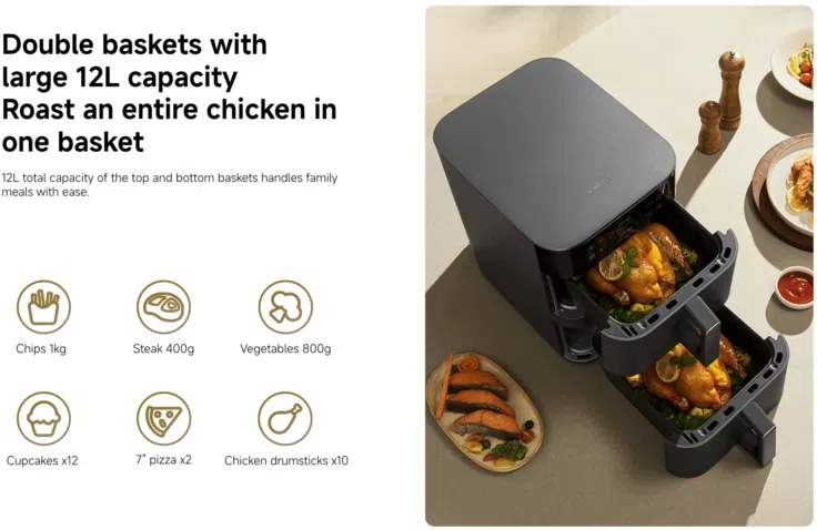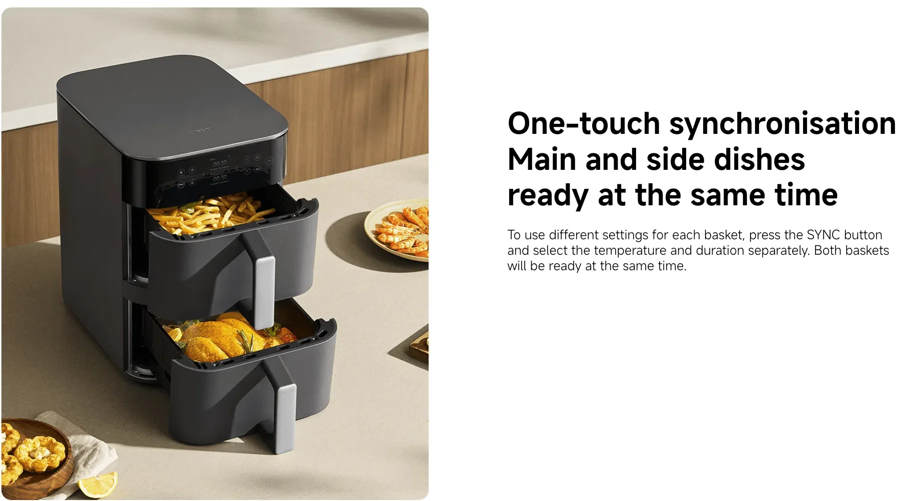Das Ergebnis ist eine Heißluftfritteuse mit riesigem Fassungsvermögen, die aber die Grundfläche eines herkömmlichen Einzelkorb-Modells hat – ideal für alle mit begrenztem Platz in der Küche.
