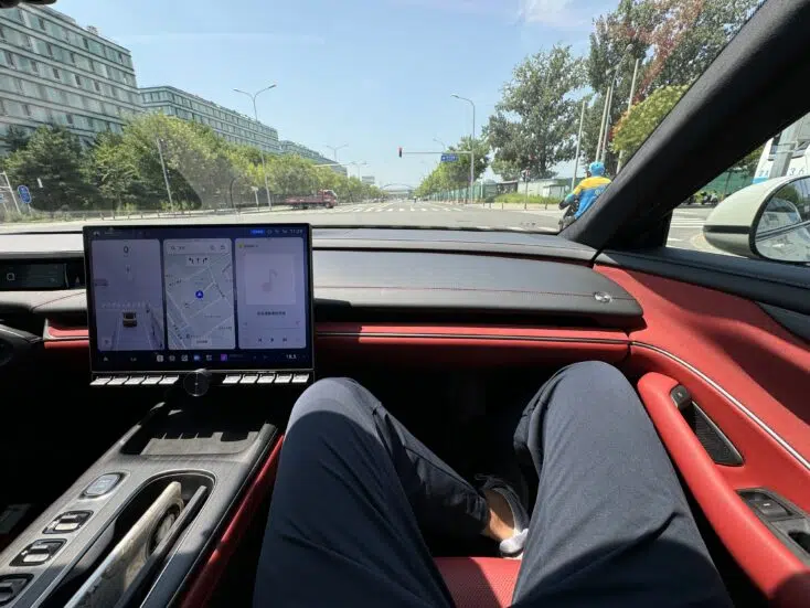Spontan konnte ich mir noch einen Platz in einer zweiten Testfahrt mit Startpunkt vom Xiaomi Headquarter in Peking sichern. Diesmal konnte ich auf dem Beifahrersitz Platz nehmen und einen genaueren Blick auf das Fahren mit dem SU7 werfen. Der ist wie die bei E-Autos so üblich auf jeden Fall sehr leise und wirkte dann doch futuristischer als zunächst angenommen. Das liegt vor allem an dem großen Sichtfeld des SU7 mit Panorama-Glasdach. Dazu hat man gerade vorne viel Komfort, mit großzügiger Armlehne und viel Platz für die Beine.
