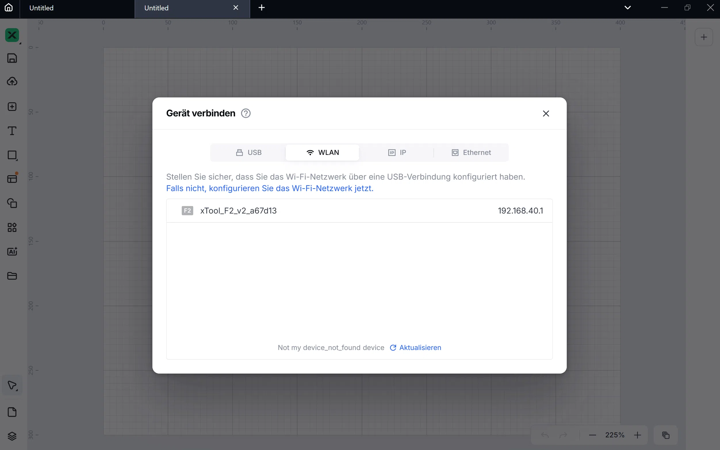 Nächster Tag… auf den xtool Seiten fand ich einen Hinweis das die Software nur im 2,4 Ghz Bereich arbeitet. Mein Mesh wechselt aber zwischen 2,4 und 5 Ghz je nach Datenaufkommen und das machte eine dauerhafte Verbindung unmöglich. Also im Router (Fritzbocks 7590) die 5 Ghz abgestellt.